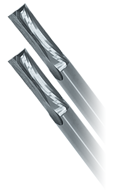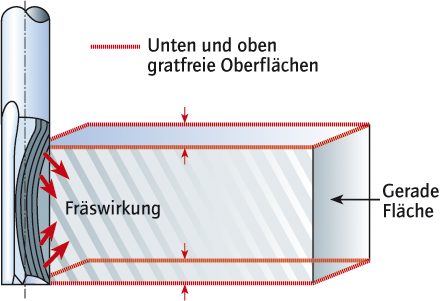 Die von Näpflin entwickelte und patentierte Schneidengeometrie erzielt hervorragende, ausrissfreie Kanten auf beiden Seiten. Im Einsatz wirkt die Schneide, mit 25° bis 30° am Nutenbeginn und Ende, zur Plattenmitte hin.